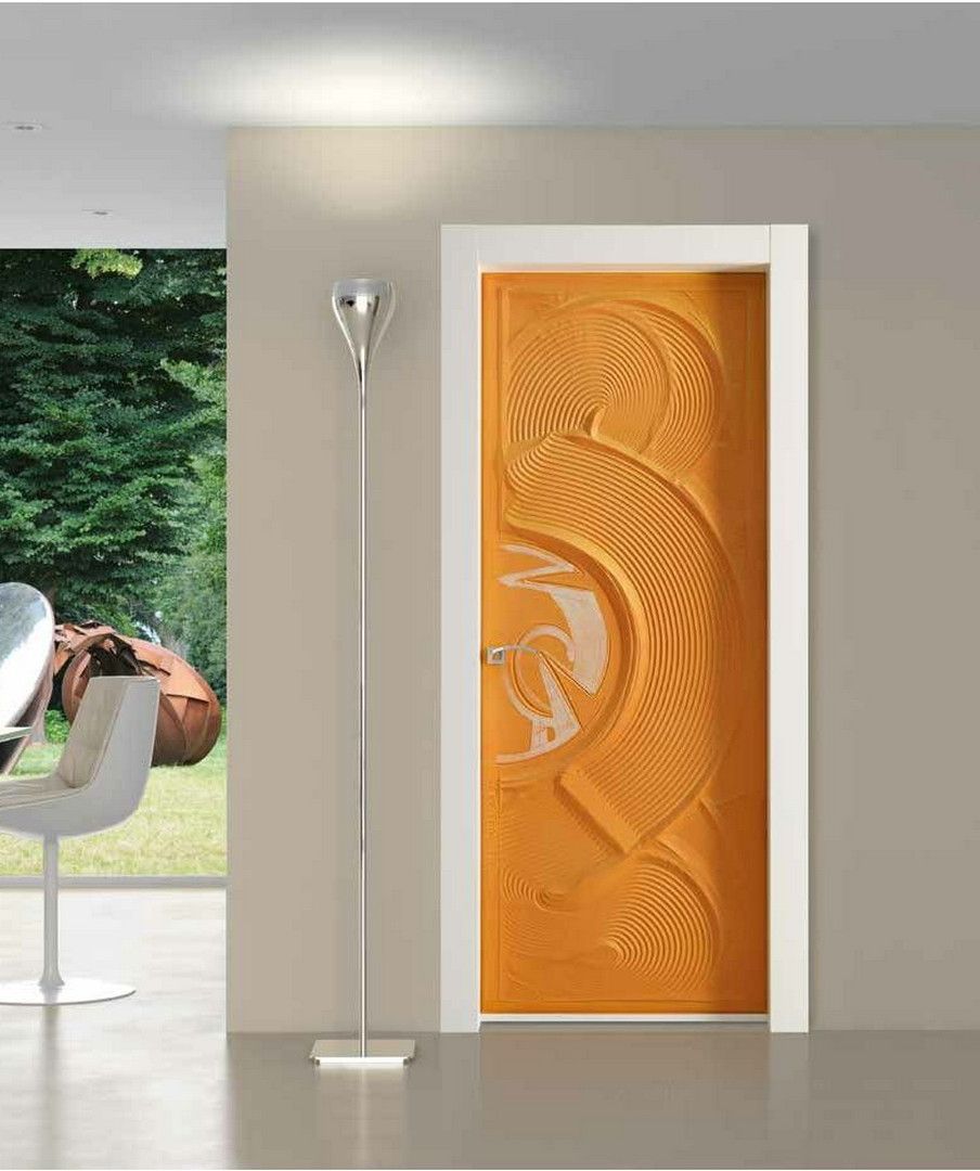 Дверь как произведение искусства. Уникальная. На дверь наносится абстрактная скульптура из песка и окрашивается вручную лично скульптором Элио Гарисом. Моделей всего семь и в нескольких цветовых вариантах. Гамму песочных глухих моделей дополняют створки из литого объемного стекла, которые повторяют линии основной коллекции.