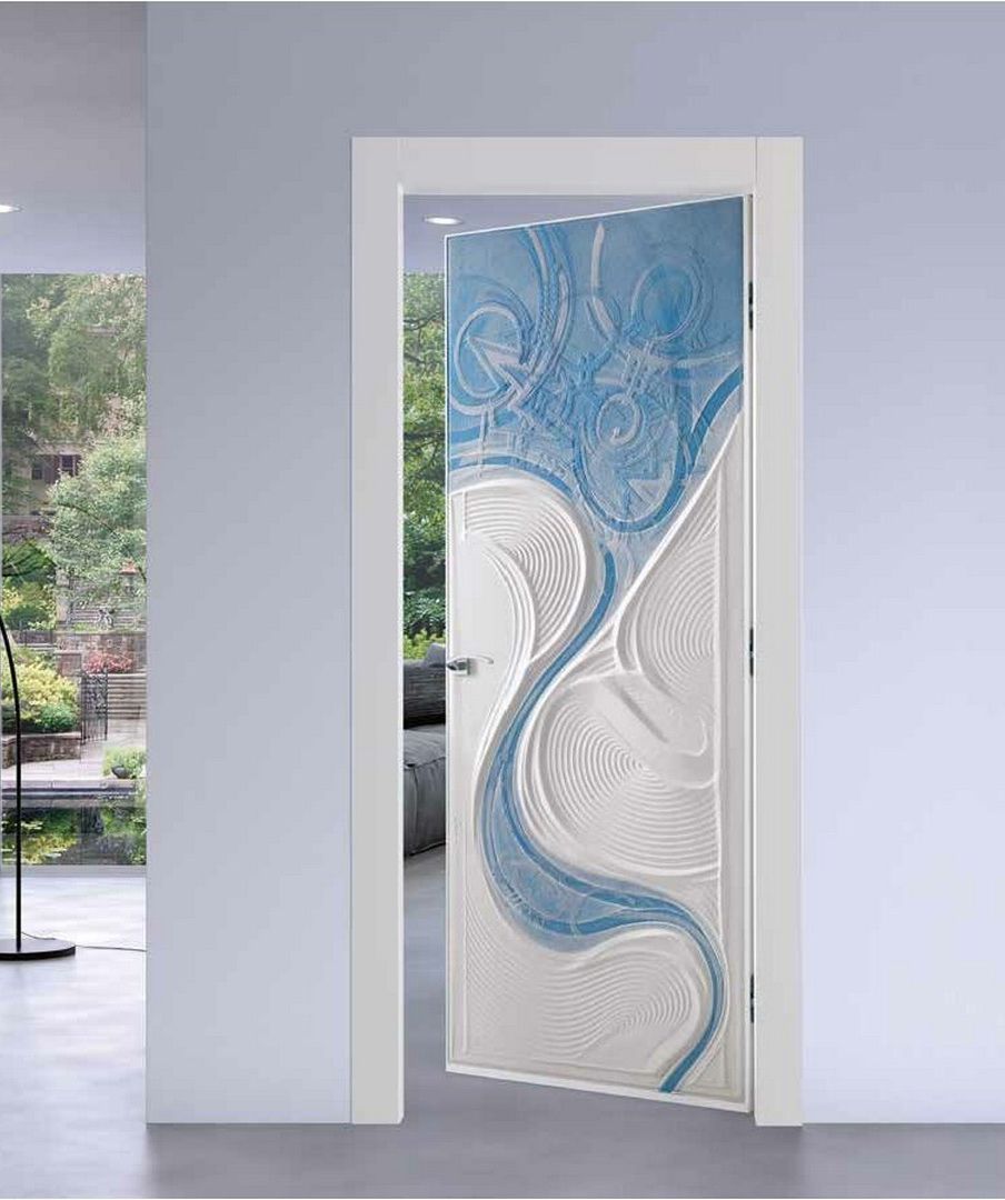 Дверь как произведение искусства. Уникальная. На дверь наносится абстрактная скульптура из песка и окрашивается вручную лично скульптором Элио Гарисом. Моделей всего семь и в нескольких цветовых вариантах. Гамму песочных глухих моделей дополняют створки из литого объемного стекла, которые повторяют линии основной коллекции.